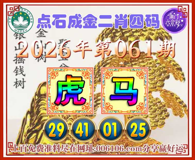 061期:《点石成金》  ♣️二肖四码 ♣️【马】【29.41.01.25】开:虎29准公开见证