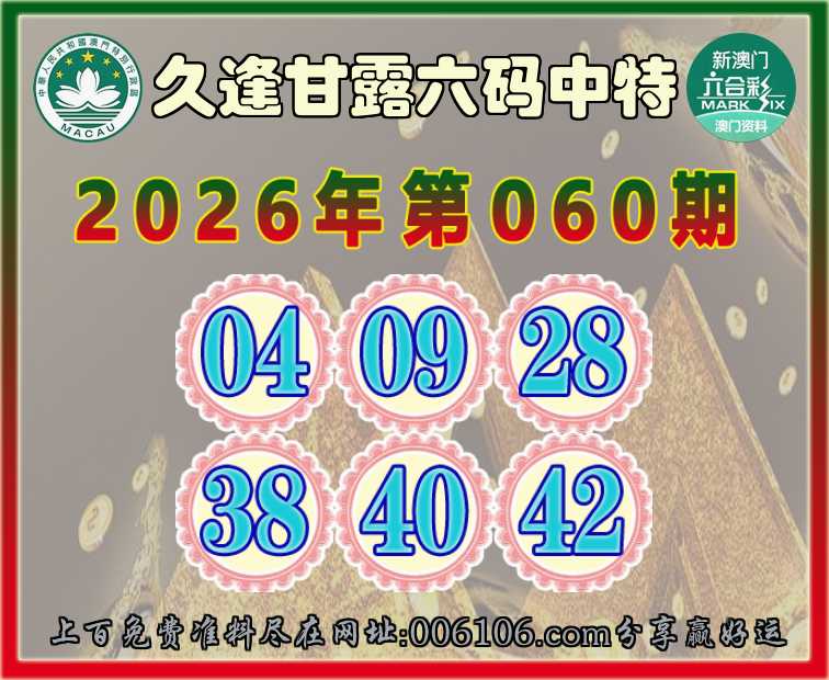 060期:【久逢甘露】 🚵‍♀️六码中特🚵‍♀️【04.09.28.38.40.42】开:09准公开见证