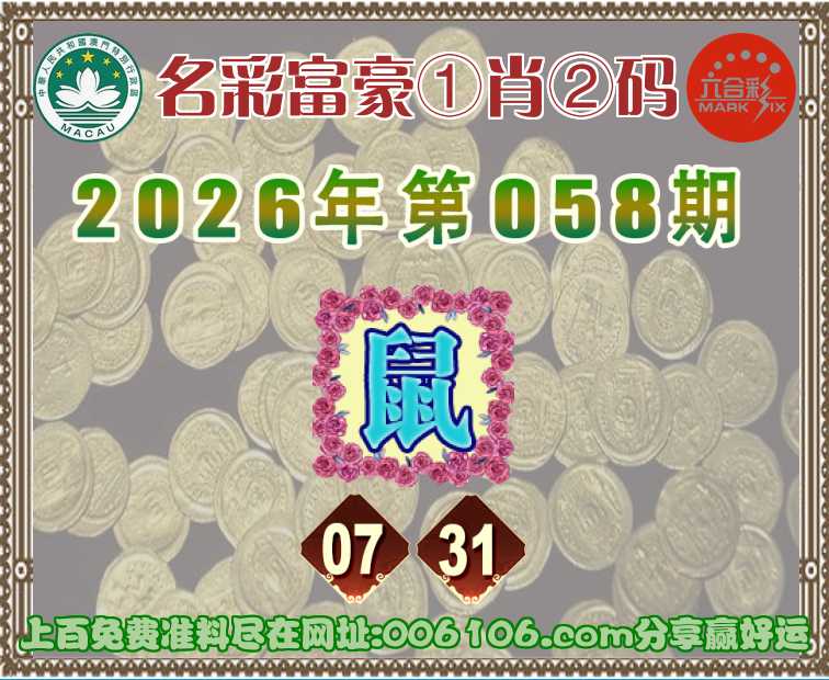 058期:〖名彩富豪〗 ♣️①肖②码♣️【】【07.31】开:鼠31准公开见证